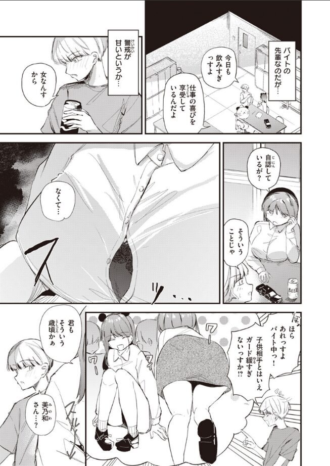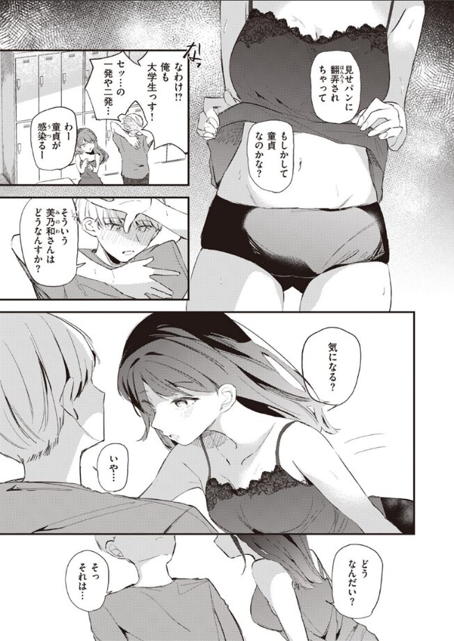 「見せパンに翻弄されちゃって もしかして童貞なのかな?」年上のバイト先の先輩・美乃和(みのわ)さんのガードの緩さにドキドキして、ついつい童貞ムーブをかます吉田(よしだ)……でも彼女もまんざらでもなくて♪ホテルに連れて来られ、ド緊張しながらも美乃和さんの手引きで童貞卒業を試みるが!?