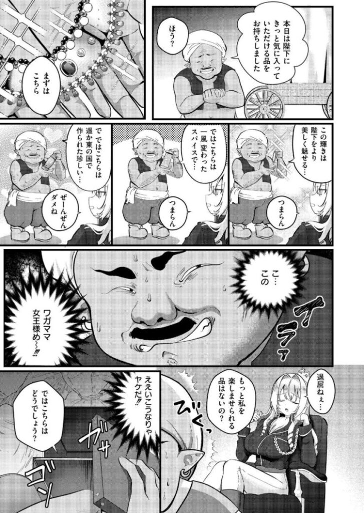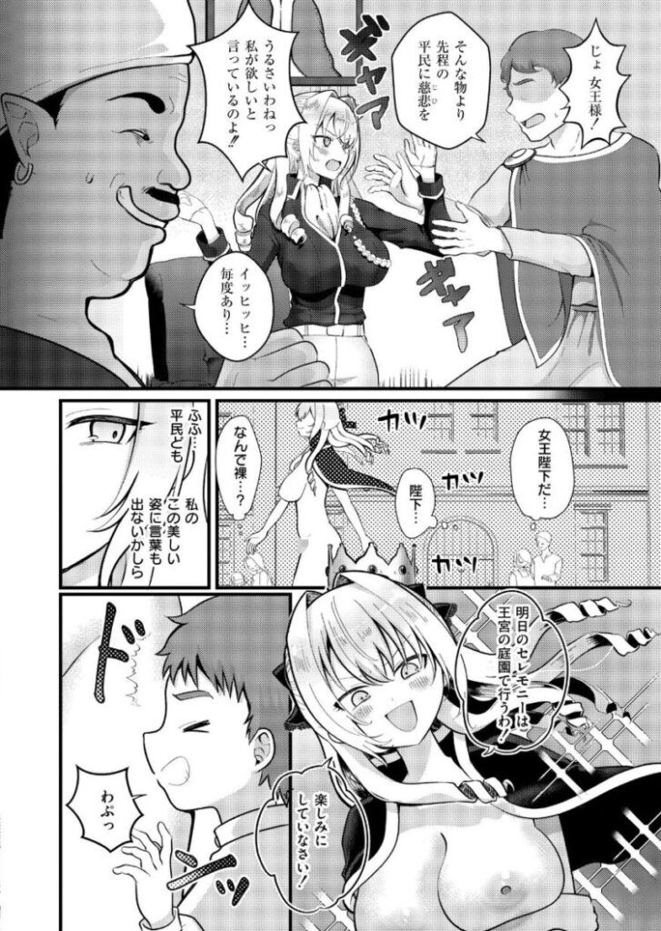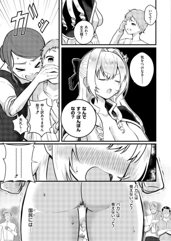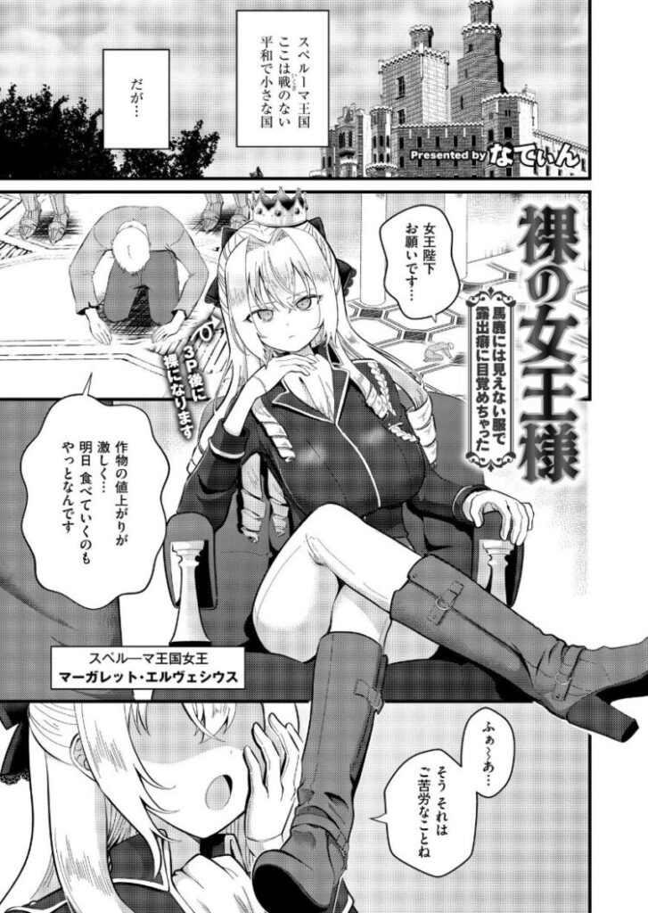 「国民(バカ)には…全部見えちゃうじゃないの!」ワガママ女王’マーガレット’は、怪しげな商人におだてられ「バカには見えない服」を買う。しかし、そんな服は存在せず、自分を賢いと思いたい女王は、裸のまま偉そうに城下町を歩いていた。たまたまぶつかった子どもから、裸であることを指摘され、マーガレットは国民には自分が全裸に見えていることに気がつく…。羞恥と屈辱でパニックになる女王だが、なぜかアソコが疼いてきて――。