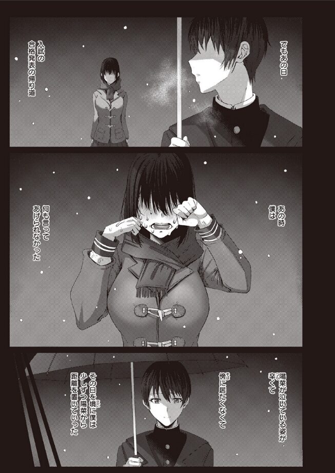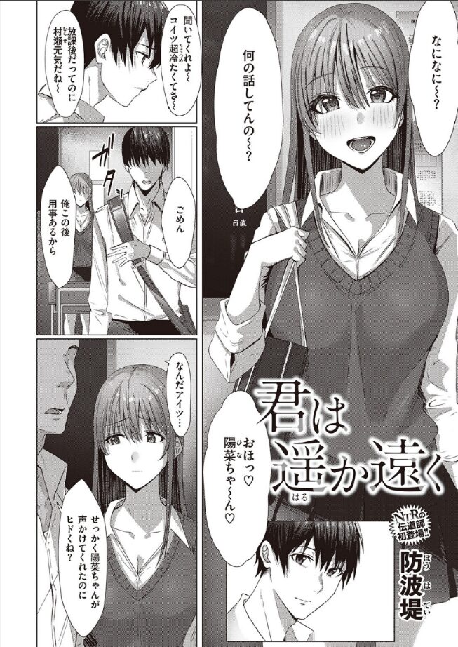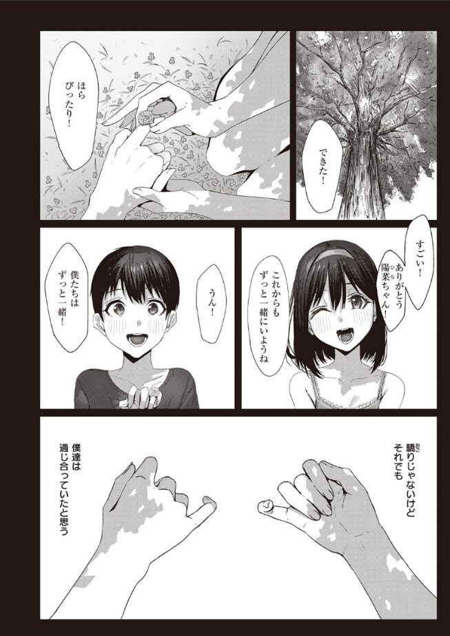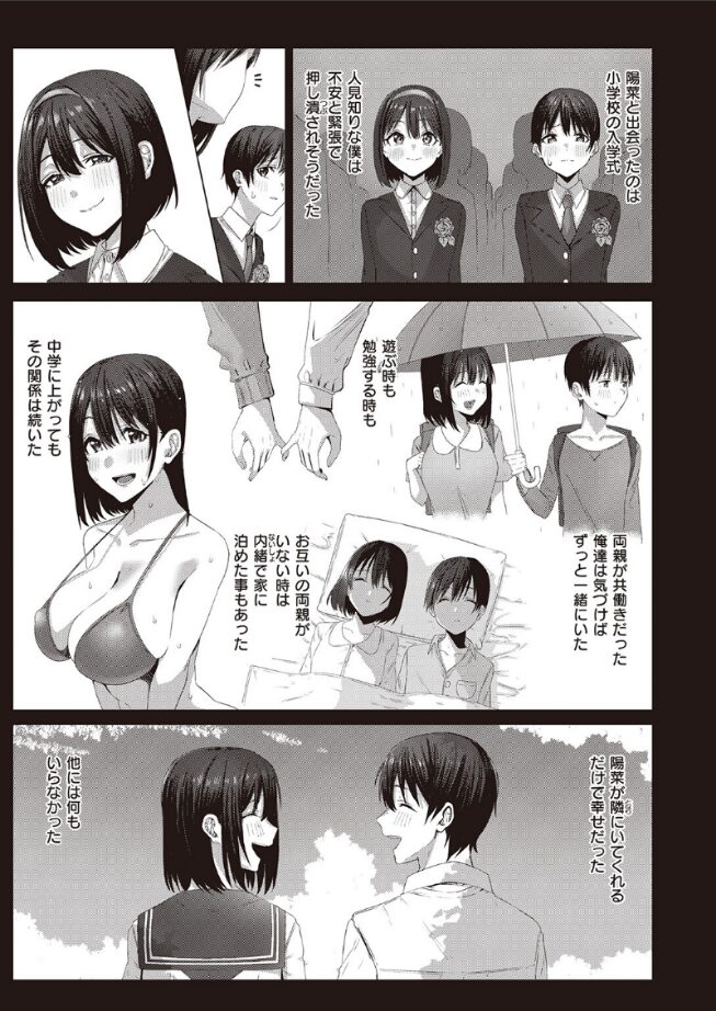 | 密かに幼馴染である陽菜への想いを持ち続けている主人公の篠原だが、陽菜もまた篠原への想いを持っている。 そんな中で陽菜は同級生の村瀬とセフレ関係になってしまっているというのが何とも切ない。 村瀬と陽菜のHシーンではすっかり「駄目な女」になってしまっている陽菜の姿がこれでもかってくらいに描かれる。 篠原も陽菜も昔から変わらない部分をきちんと持っているにも関わらず、お互いの気持ちに触れることなくすれ違う。 果たして二人はお互いの気持ちに気づくことが出来るのだろうか。 ラストのコマの台詞よろしく答えは見つからない。 |