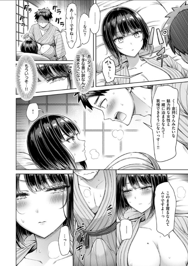 | クールなシゴデキ上司の倉持さんの「表情」がとても良い。 一気に表情が崩れて豹変という感じではないのだが、ちらほらと見え隠れする可愛らしい表情だったり、クールな感じが崩れる瞬間みたいなのが非常によく描けている。 これぞクール系女子の醍醐味!と言った要点を押さえてる感じ。 旅館に泊まることになったというシチュエーションもとてもよく生かされており、行為シーンが和室とのもそそる。 ボブカットのシゴデキOLと和室の相性がこんなに良いとは思わなかった。 浴衣がはだけた胸元にホクロを発見したりと、全体的に細かな描写が良い作品。 |