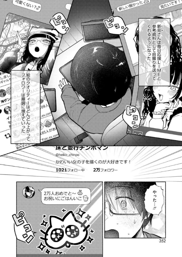 | オタク男子版のシンデレラストーリーである。 いや、醜いアヒルの子かも? 内気でオタク気質の主人公の佐古は絵師としては有名だが、学校では陰のもの。 それがクラスメイトの地雷系女子に身バレしてしまうものの、その地雷系女子は自分の古参フォロワーで… という話なので、起承転結がはっきりしているのである。 そのため御伽噺というか寓話的というか、報われる話になっているのである。(成人漫画なのでHをもって報われる訳ですが) オタク系男子×地雷系女子という組み合わせにも関わらず、暗いシーンが一切ないのが良い。 地雷系女子ののんてゃも結局佐古に惚れ込んでしまうし、佐古も実はのんてゃのことを陰で想ってたのが分かるし。 Hシーンは関係性を見ても分かるとおりのんてゃちゃんが上になってリードしてくれる感じ。 不慣れな佐古君らしく、終始騎乗位で果ててしまうのだがお互いの思いの丈を打ち明けながらのHシーンはグッと来るものあり。 ちなみに最後はフォロワー数も3万人に達して超ハッピーエンド。 みにくいアヒルの子が白鳥になった瞬間という感じである。 |