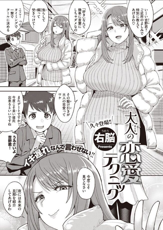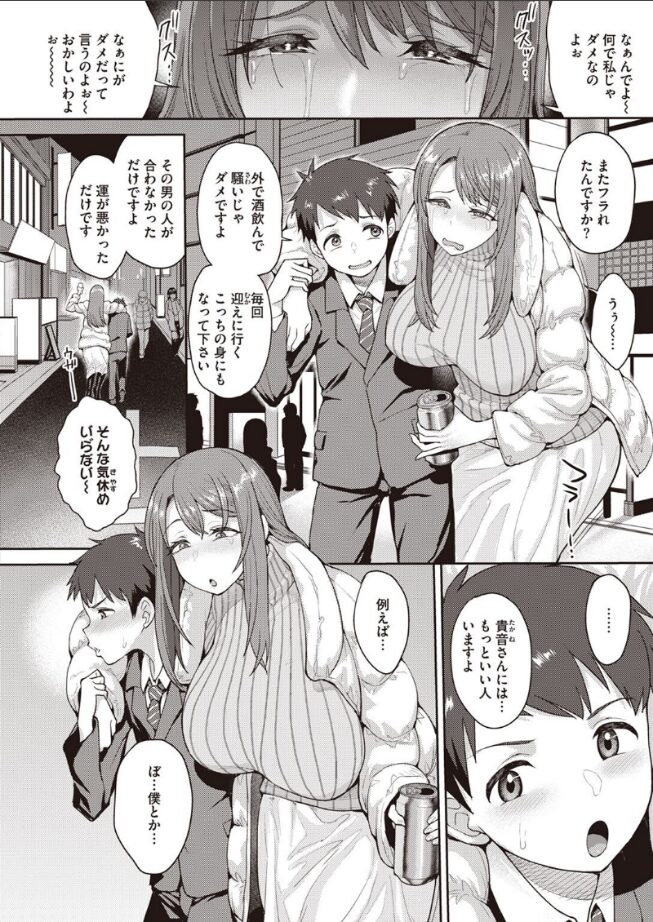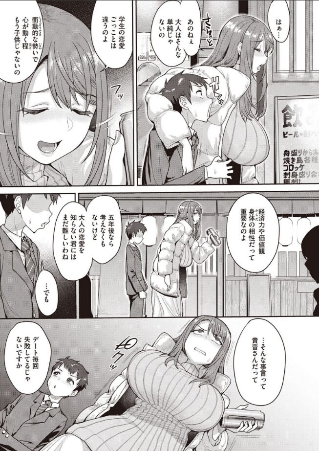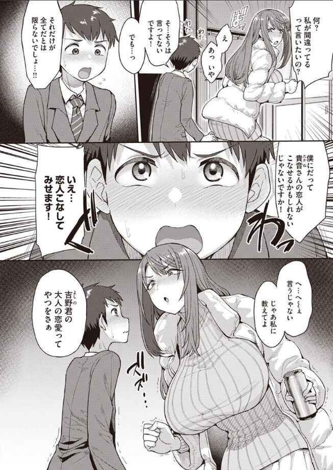 「じゃあ私に教えてよ。吉野(よしの)君の大人の恋愛ってやつをさぁ」ご近所に住む年上のお姉さん・貴音(たかね)さんに密かに想いを寄せている男子学生の吉野君。なかなか恋人ができず今日もフラれて酔って泣きながら帰ってきた貴音さんを介抱しながら、吉野君は自分の存在をアプローチするもまったく相手にされず見くびられてしまう。引き下がれなくなった吉野君は見得を切り、自分の想いを強気に伝えるのだが……?
