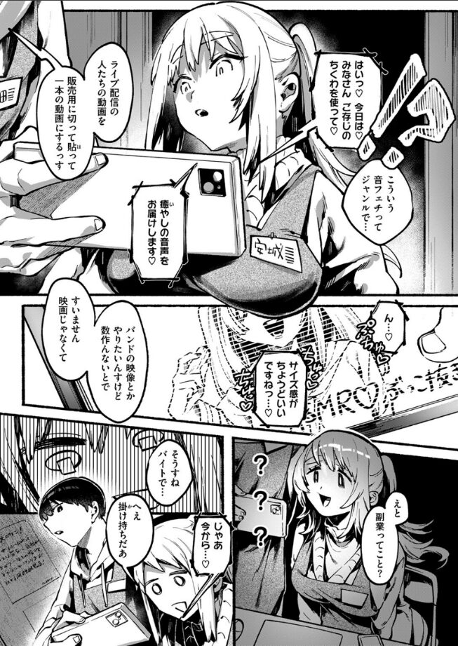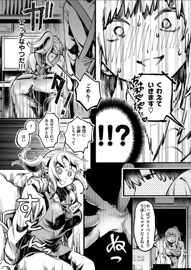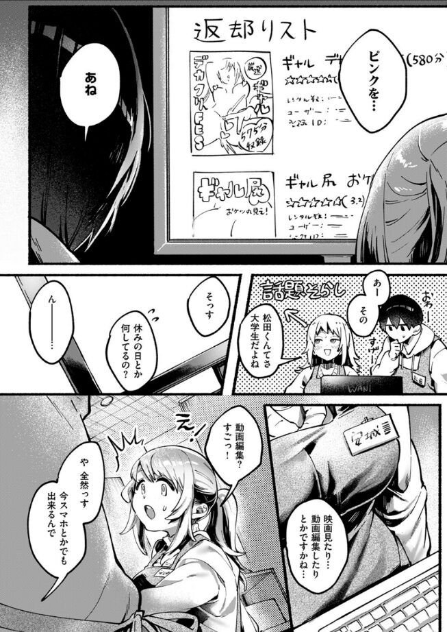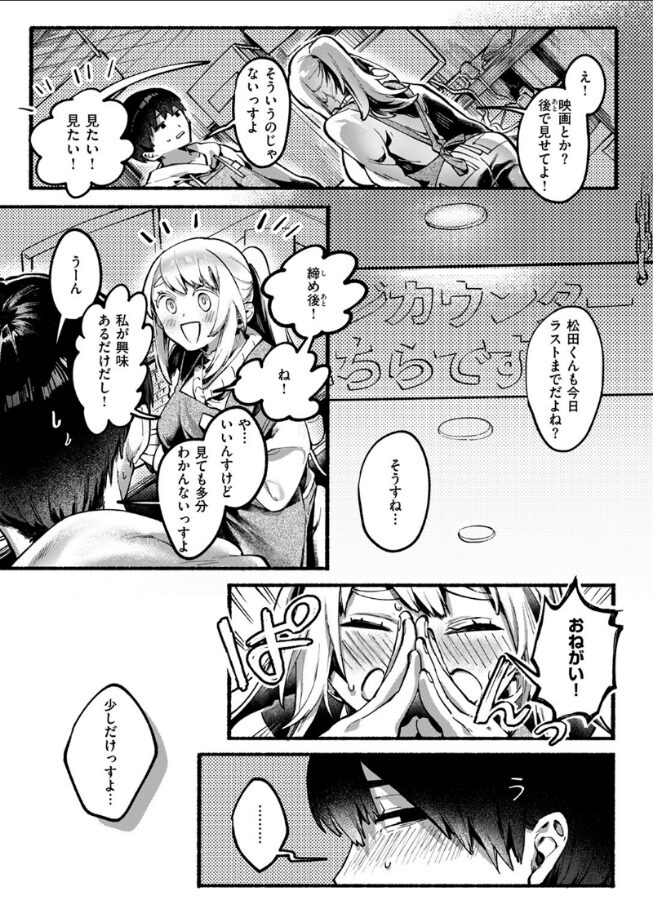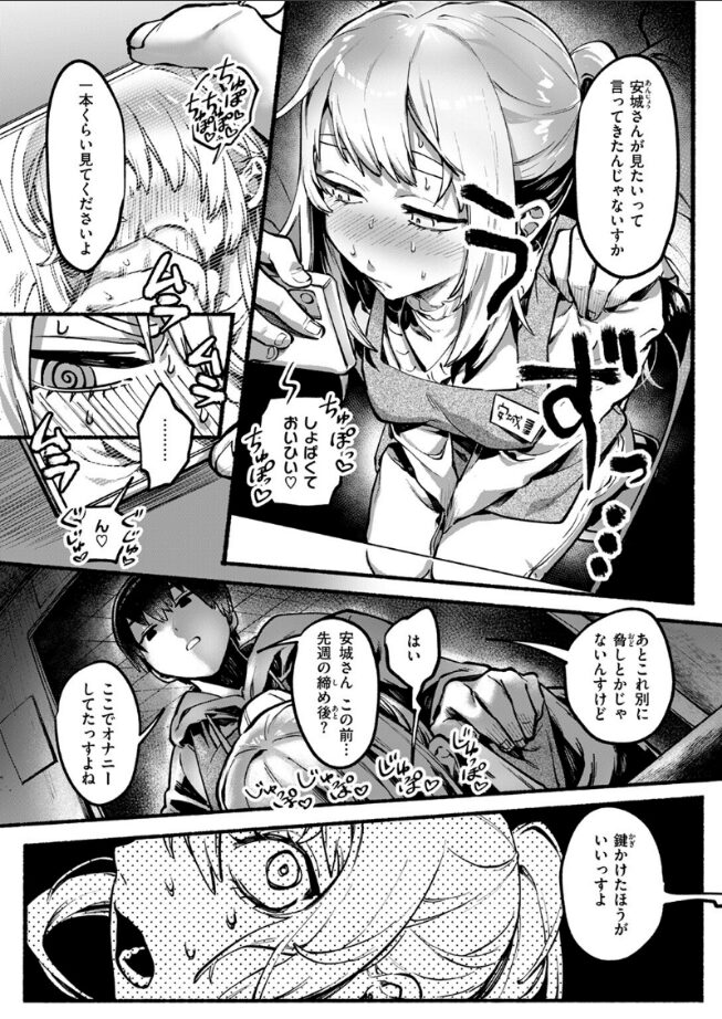 | レンタルビデオ店でバイトしている安城さんが、同じ時間帯のシフトに入った松田くんと世間話をしているうちに、お休みの日は動画編集をしていると聞き、興味津々で就業後に作品を見せてもらうことを約束するも、その動画はエッチな作品で気まずくなってしまうという展開が面白かったです。 軽い気持ちで松田くんのプライベートに踏み込んでしまったことを激しく後悔し、サクッと話題を変えて逃げ切ろうとするも、サクッと椅子に押さえつけられ、半強制的に動画を見せられる中で、最も知られたくなかった相手から想定外の爆弾を投げ入れられ、一気に全身に震えが走ってしまうところが見どころだと思いました。 決して脅しではない、誰にも言わないと言いながらも、フェアという言葉を使う松田くんに対し、動画を見てムラムラのスイッチが入ってしまった安城さんが、口止めするためかのように見せかけて、自身の溜まりまくった性欲を解消しようとするところがよかったです。 |