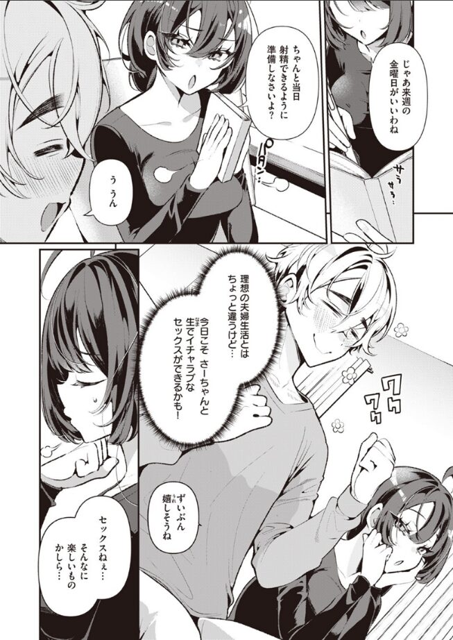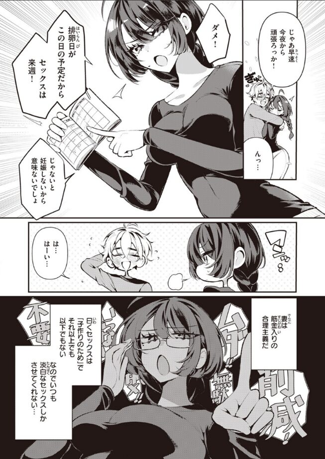 超合理主義者の妻さーちゃんは、エッチも子作りのために行うものだからと割り切っており、する日も事前にスケジュールを組んで、効率的だからとローションを使って前戯すら省きサクッとこなす始末だったのに、思うような結果が出ず、ちゃんと気持ちよくなるようにしなければと考えを改めるところがよかったです。