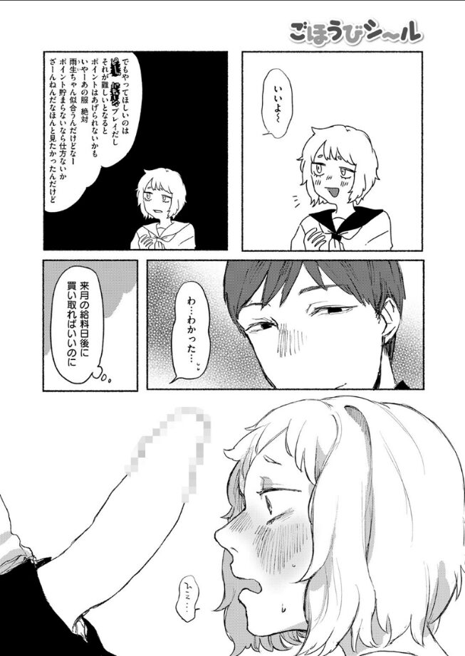 | 服欲しさに主従関係になってしまう… というストーリーではあるがご主人様状態になるのは彼氏だし結局、最終的にはヒロイン雨生ちゃんから求めてしまうのでキツい感じはしない。 しかし、終始絶妙に不穏な雰囲気があるのが特徴。 主従関係になる雨生ちゃんの動機(服が単純に欲しいだけ)や志道くんの要求もややソフトで丁度良い感じに嗜虐性が刺激される。 内容としては制服を着せられ玩具攻めから始まり、ア○ル開発・二穴攻めという感じ。 タイトルのごほうびシールとは、志道くんの要求を達成した時に貼ってくれるシールの事。 10枚貯まるとコンプリートで欲しかった洋服が貰えるというシステムなのだが、最終的には要求そのものがご褒美になって行くというお話です。 シールコンプリート後に自分の変化に戸惑いつつも、道志くんにおねだりしてしまう雨生ちゃんの姿が非常に可愛らしい。 新しい性癖が開発された上、欲しかったお洋服が手に入ったようでなんとも良い話であります(…間違ってないよね?) |