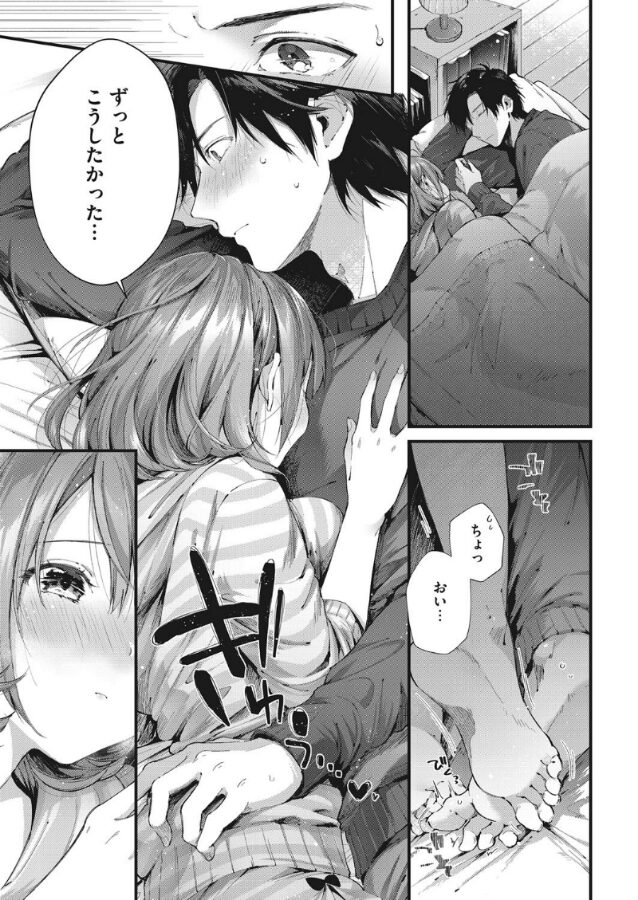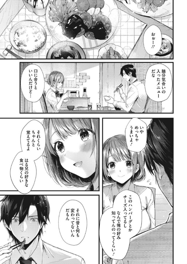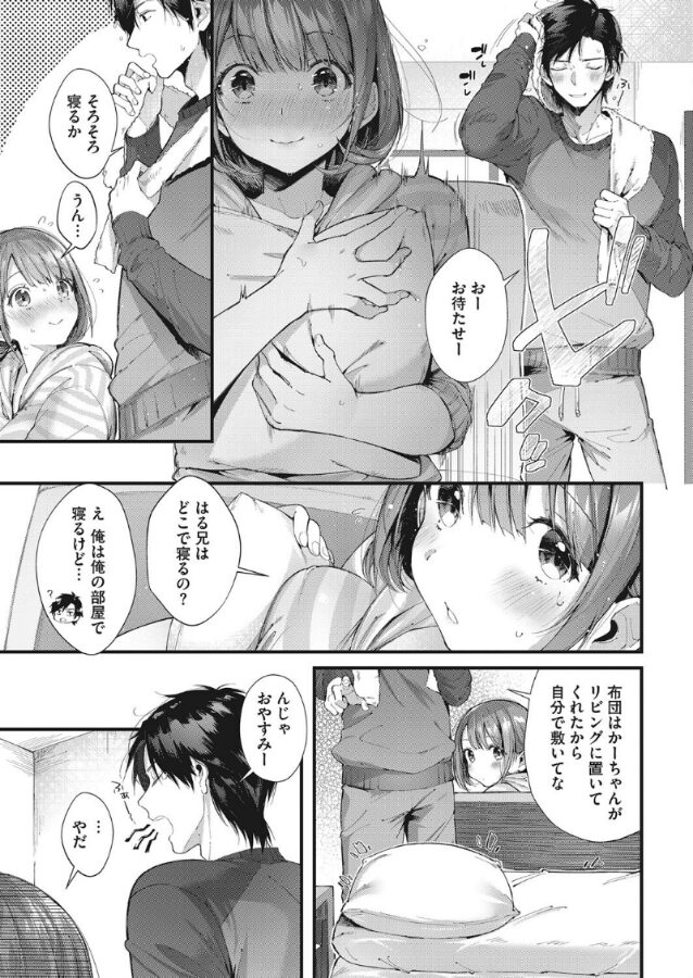兄妹のように仲良く育った幼馴染みの千鶴が、はるの家にやってきて夕飯を作って待っていた。体が弱く、入退院を繰り返していた千鶴と数年ぶりに会うと、制服にエプロン姿がよく似合う美少女に成長していた。食事後、居間に敷いた布団ではなく、はるのベッドで寝たいと駄々をこねる千鶴。はるがいなくなると寂しがるのは、昔から変わっていなかった。