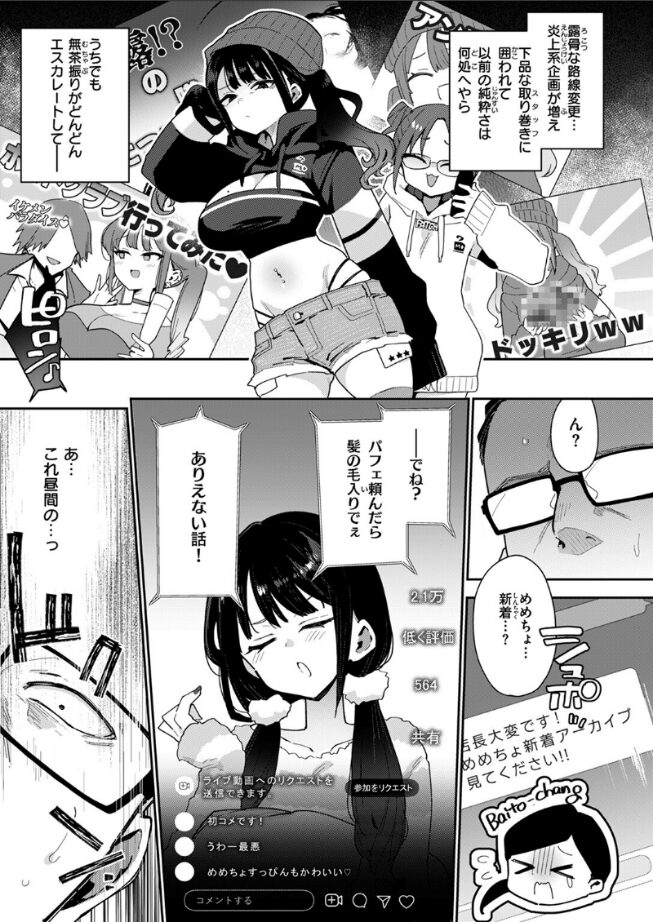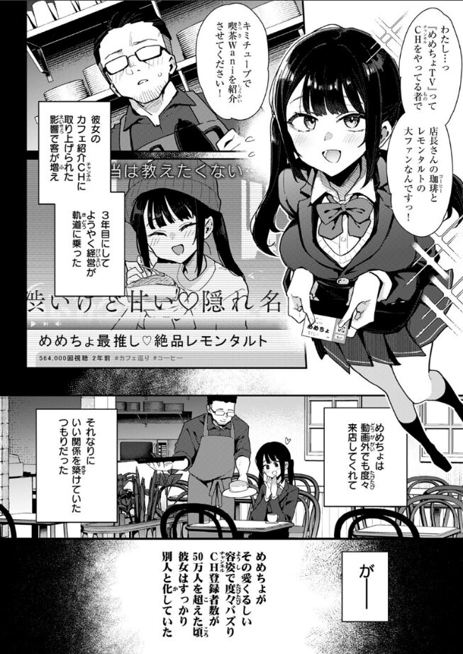 | 純朴だった子がインフルエンサーになってクソ生意気になってしまい、しかしながらお仕置きによって「淫フルエンサー」になるという。 言うならば分からせストーリーである。 配信者のめめちょがまだ純朴だった頃の姿がきちんと描かれているのが好印象。 そっからの裏表があるインフルエンサー化・さらにはガチムチ店長による「分からせ」なのでエロさが際立ちます。 「分からせ」られる二人(めめちょと助手のスタッフ)の性悪っぷりもかなり凶悪で、いい感じにスパイスになっておりエロさも倍増という感じ。 作者の印度カリー氏の乳の描き方にも技ありという感じで、めめちょにしても女性スタッフにしてもちょっと残念なおっぱいをしているのが妙にリアル。 顔は良いけど、残念な身体の二人は店長だけではなくて飲食店組合の皆さんにお仕置きされてしまう。 という事で複数プレイ。そして店長との行為も生配信。 勧善懲悪…いや勧性懲悪という感じの内容ではあるものの最終的には丸く収まる内容になっているのが面白い。 |