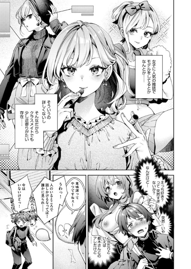 | ファッション雑誌でモデルをしているギャルヒロインのココロから、校舎の裏で誘惑されてこっそりセックスをする刺激的なシチュエーションに興奮しましたし、制服姿の状態で濃厚なセックスが行われるので制服コスプレやJKモノが好きな方にお勧めできる作品だと思いました。 Hシーンが濃厚なのにラブコメ風の明るいストーリー展開なので最後まで楽しく読むことができましたし、手コキやココロのオッパイへの愛撫など、前戯シーンが充実していて読みごたえがありました。 ココロとの正常位のシーンではココロの美しい形の巨乳が激しく揺れている様子が丁寧に描かれていましたし、膣奥をピストンされている時のココロの快楽に満ちた表情がエロ可愛くて心を鷲掴みにされてしまいました。 |