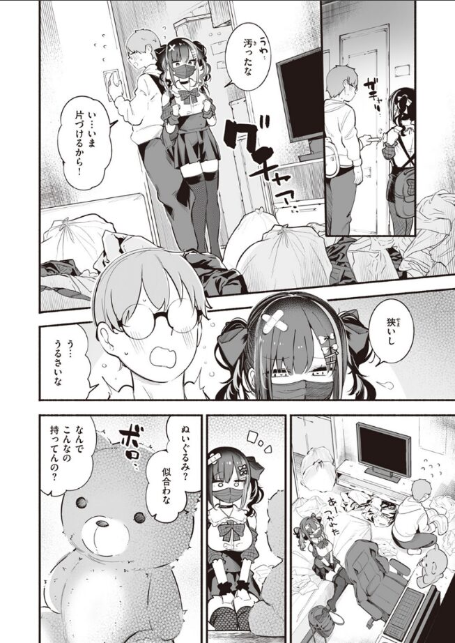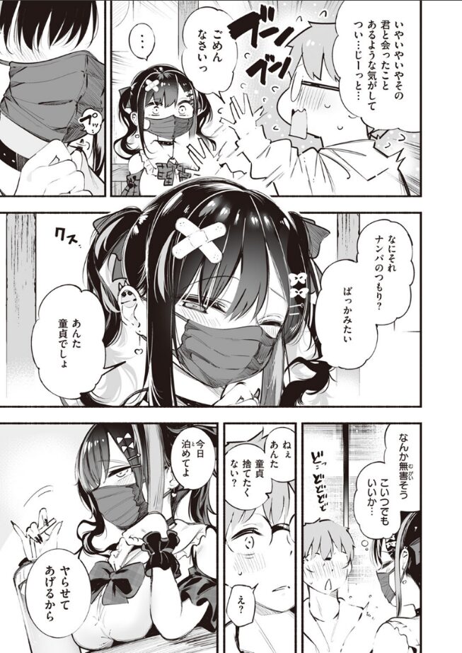 | いわゆるパパ活でお金を稼ぎながら無気力な毎日を送っていた地雷ちゃんが次に目をつけたのが、特にお金も持っていなさそうないかにも草食系の気の弱そうな男子だったのは意外でした。 それは、男子は地雷ちゃんをどこかで見たことがあると言ったためですが、ナンパの類いだと思って特に気にせず、今夜家に泊めて欲しいと言い出し、その家までついていく場面で早くも期待が高まります。 ここで地雷ちゃんが男子のかつての幼なじみのちのであったことが分かり、2人はこれまでに会えなかった時間を埋め合うかのように行為に励みますが、ずっと会いたいと思っていたのはちのの方で、その分積極的にそれを主導する姿に興奮しました。 最後ももっと朝まで続けようと元気たっぷりのちのの姿がとてもかわいい終わり方でした。 |