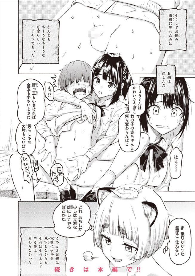 | ドスケベたぬきがショタ風少年とヤッてしまう話です。 人里に降りてくる理由がオナニー用のタケノコを求めて…というエロすぎる理由。そこで男の子に目をつけ、仲の良い女子に化けてそのままヤッちゃう展開がストレートすぎていい。 少年のチンポの小ささにガッカリするも、エロだぬきはひたすら発情して童貞少年とヤッちゃいます。 フェラパイズリまでは想像できますが、まさかのアナルセックスまで!性欲旺盛なたぬきちゃんの身勝手っぷりと、そのたぬきに騙されて発情してしまう少年の組み合わせはなかなかです。 元のたぬき美少女も、化けたあとの幼馴染もどちらも可愛い。デカ胸を押し付けて欲情させていくテクニックは人間以上のあざとさで興奮しました。 |