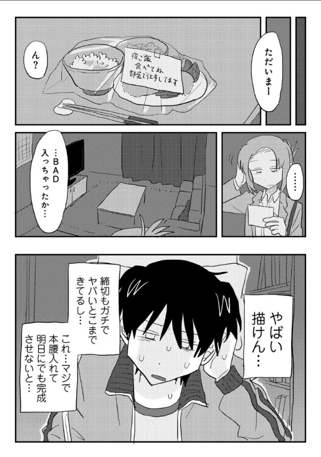 売れない漫画家の翔馬が、ネットに書き込まれたアンチコメを見てはショックを受け、締切までに描き上げなければとファミレスに行くも結局描けず、日に日に病んでいくのを妻の絵里は気丈に励ますも、実は彼女もレスや年齢のことでいっぱいいっぱいになっていたというリアルな悩みに引き込まれました。