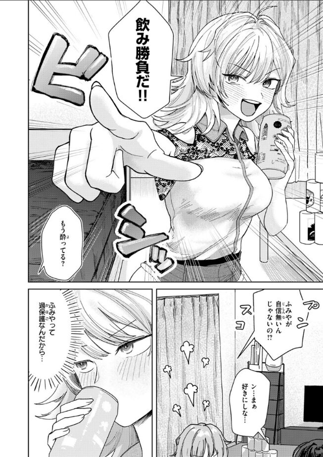 | 宅飲み中の女子大生であるいちかとその彼氏のふみやの物語であるが、この一見するとよく有り難ちな展開かと思いましたが、いちかの巨乳がもうたまらなかったので読みました。ページ数も26ページと少なめだったのであっという間に読み終えてしまいました。 いちかが寄ってトイレから帰ってくると床で乳を出して酩酊状態。この展開は正直読めなかったのでこの展開にワクワクしてしまいました。いちかをベッドに連れていくふみやだったが、いちかがムラムラしてきてふみやにキスをしていってそれからいちかが段々と大胆になっていってふみやにオナホしてもいいよと囁くところに興奮しました。 ふみやは酩酊状態で動けないいちかをバコンバコンと突いていちかをイカセて、さらには中出しをするという展開になっていきますが、この過程がもう興奮しまくりで面白くて一気読みしました。 |