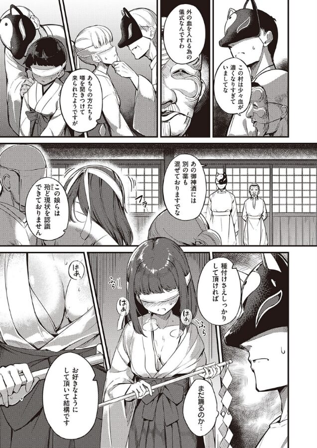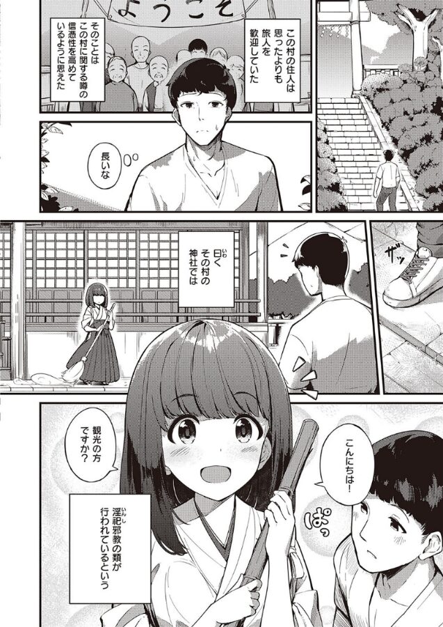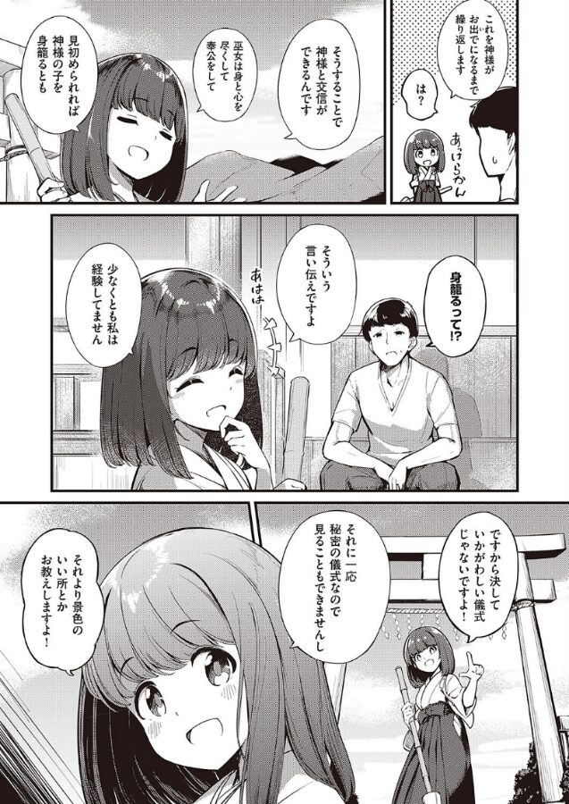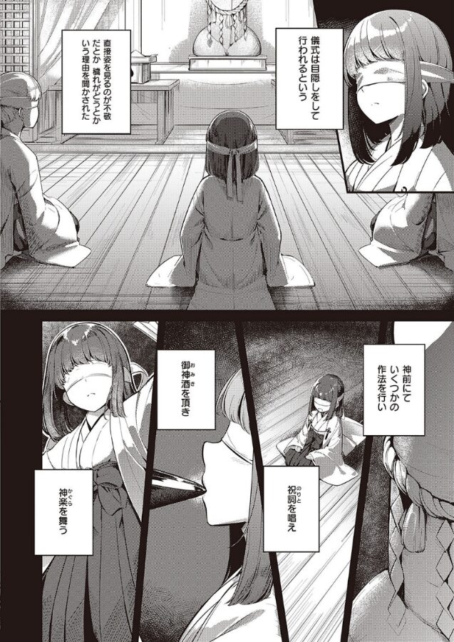 とある村を訪れた主人公は、純真な巫女・弥琴(みこと)に出会う。『神と性交をする』という噂について、「言い伝え」だと笑う彼女。しかし、その噂は現実であったと証明されて…。叙情派インモラリスト・ヨシカ先生描く、村の巫女が’神様と性交している’という噂の村に潜入した主人公が見たものとは――。