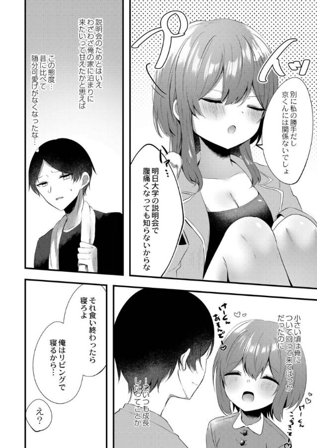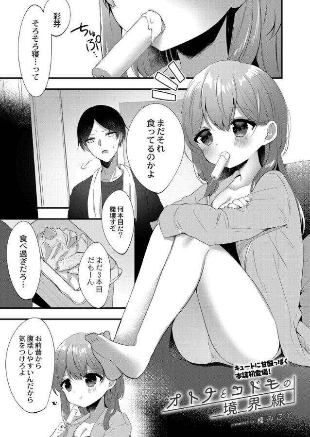 櫁みこと先生キュートに甘酸っぱく初登場!!ヒロインの彩芽は大学の説明会の用事でおさななじみの主人公の家に宿泊する。彼の事が好きなヒロインは子ども扱いされることに業を煮やして…