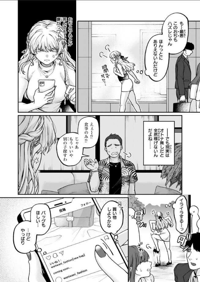| パパ活をしながらホスト遊びをしている玲亜がオジサン達と乱交セックスするストーリーです。 Hシーンが濃厚なだけでなく、世間の中年男性の事を舐めきっている玲亜がハードな乱交セックスで徐々に快楽落ちしていって、メス犬になっていくストーリー展開が痛快でした。 オジサン達のペニスをフェラでご奉仕しながら玲亜がバックや正常位をするHシーンに興奮しましたし、玲亜の膣の中にフル勃起した巨大ペニスが入っている様子がアップで描かれていてHシーンの演出が非常に良かったです。 中出しや顔面射精のシーンが豊富なのでHシーンに感情移入しやすかったですし、快楽で蕩けた表情を浮かべながら潮吹き絶頂している玲亜のエロ可愛いリアクションに萌えました。 |