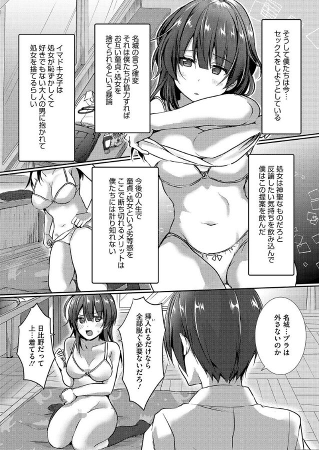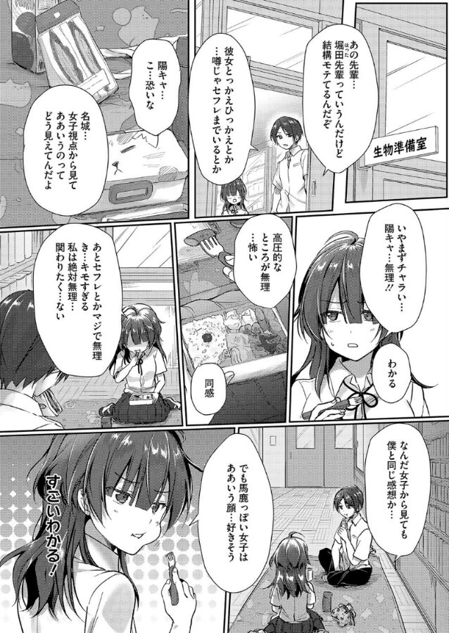 僕(日比野)と陰キャ仲間の名城は童貞と処女を捨てるため打算的にセックスをした。それからも二人の関係は変わらなかったが名城は徐々に垢抜けていき、嫌っていたはずの陽キャの堀田先輩とセックスをしているところを目撃してしまった。それでも僕は何も言えないまま二人の関係は変わらず続いていく……。