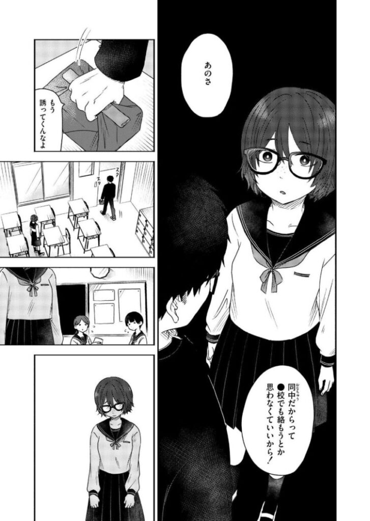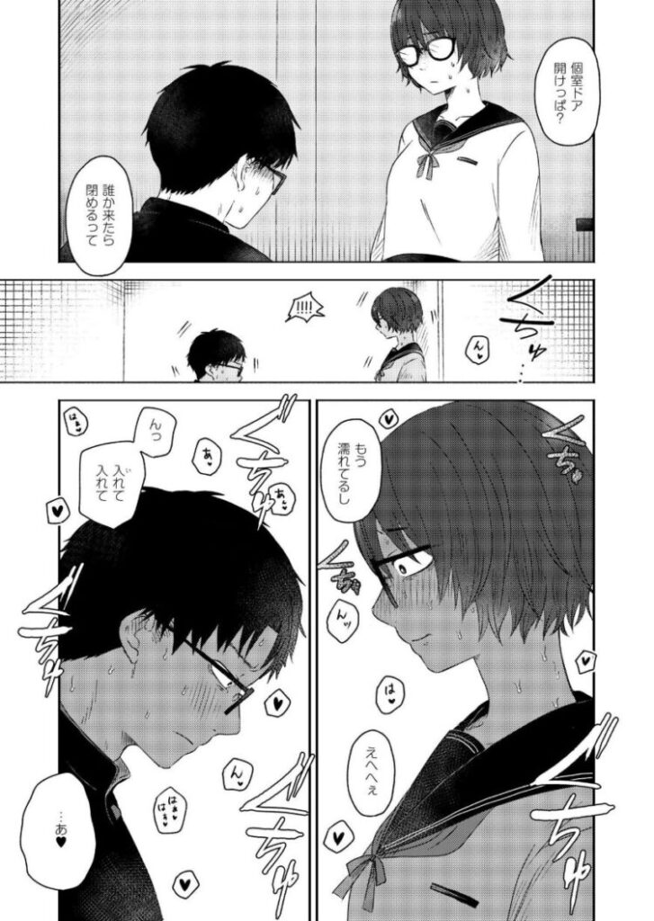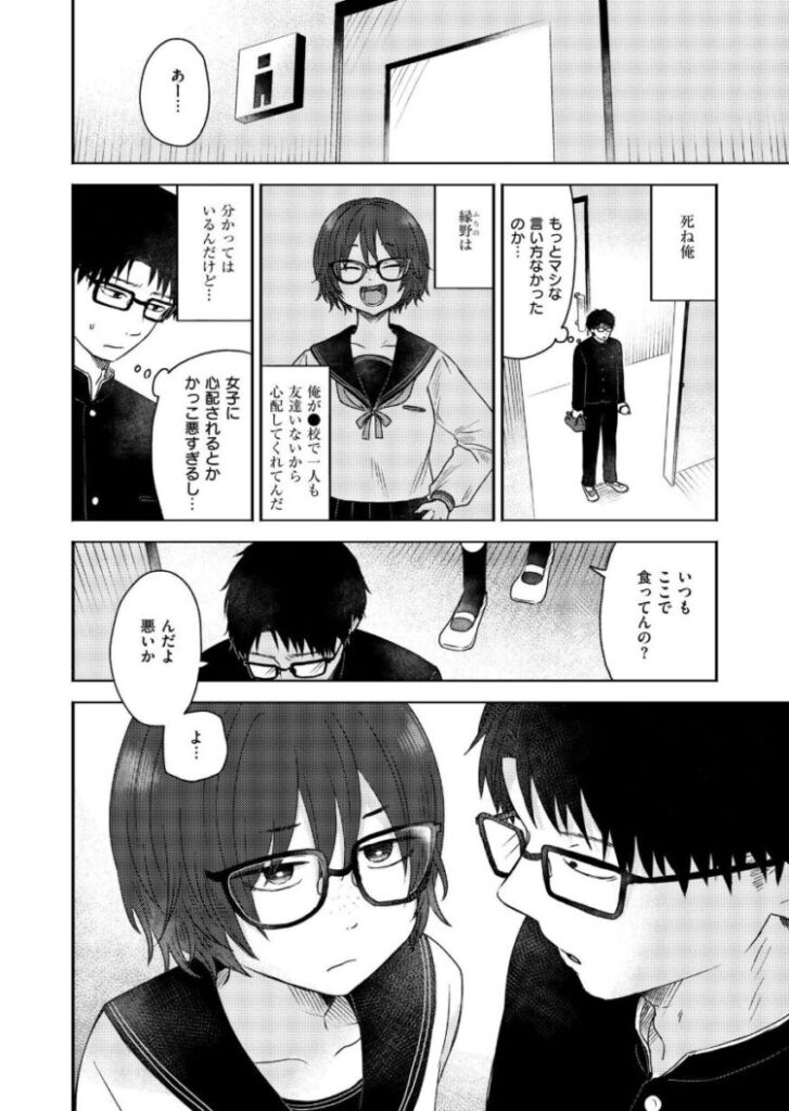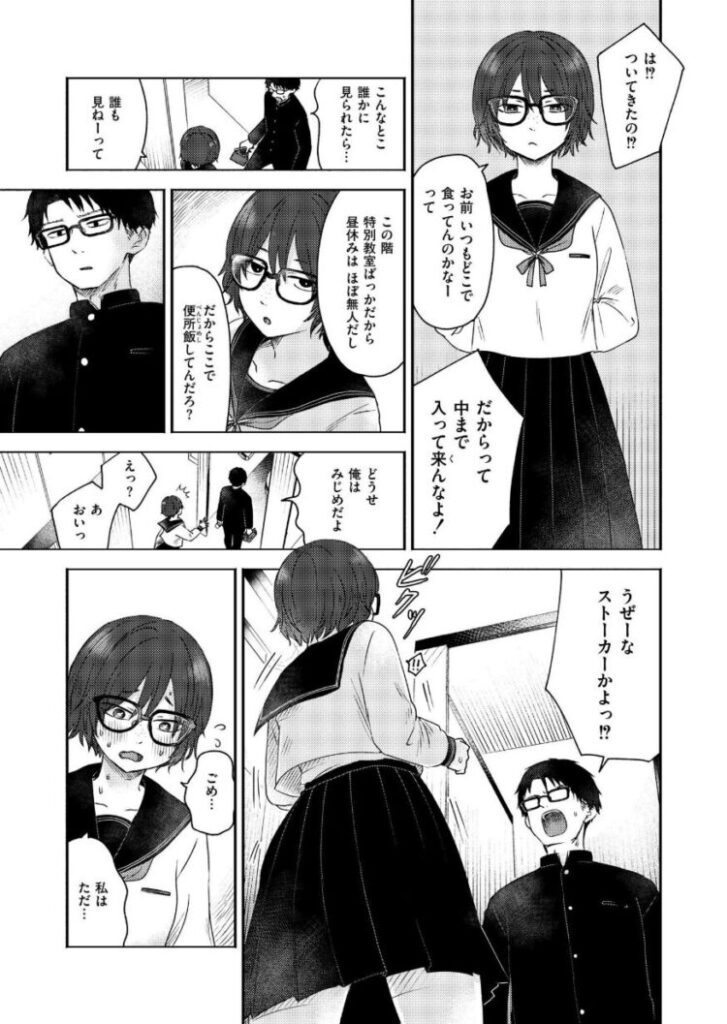 | イジメられているわけではないものの、お昼休みになると一人でどこかに行ってしまう鶴岡くんのことを心配して、陰キャではあるものの同中だった縁野さんが一緒に食べようと誘ってくれるたのに、プライドが災いして素直に受け入れられないという、10代だからこその関係性がリアルに描かれていると思いました。 わざわざ人気のない階のトイレを選んでいたぼっち飯をしていた鶴岡くんが、心配してあとをついてきた縁野さんに思ってもいない暴言を吐いてしまったタイミングで、陽キャカップルがエッチをするためにトイレに近づいてきたことに気づき、思わず個室のドアを閉めてしまうところにドキドキしました。 決して声や音を出してはいけないと息を潜める二人に対し、カップルは隣の個室に誰かいることを認識した上で、あえて音や声を出して刺激するところが面白かったです。 想定外のことに巻き込まれた二人も、エッチなことには興味のあるお年頃ということもあり、最初は冷や汗タラタラだった二人が、徐々に赤面していく変化が面白かったです。 |
