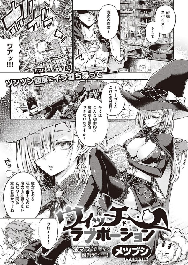 孤児の俺を育ててくれた巨乳魔女のクロエ。なぜ親切にしてくれるのか疑問に思った俺は、彼女の気持ちを知るため、自白剤をこっそり投与することに。薬の効果でしっかりと自白してしまったクロエは、恥ずかしくなったようで仕返しとして俺の局部を舐めだして!?超大型新人・メツブシ先生贈る、クールな巨乳美人魔女は弟子に自白薬を盛られて…秘めたアツーイ想いをマジ告白!?