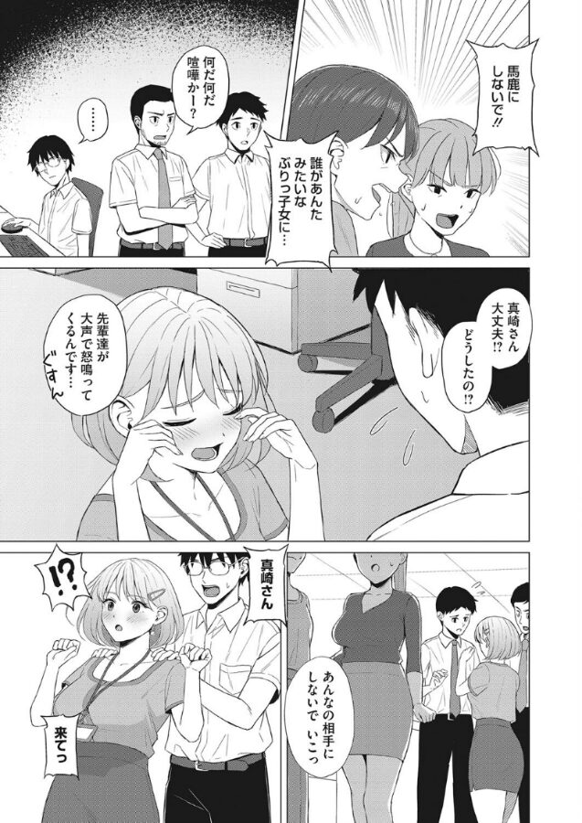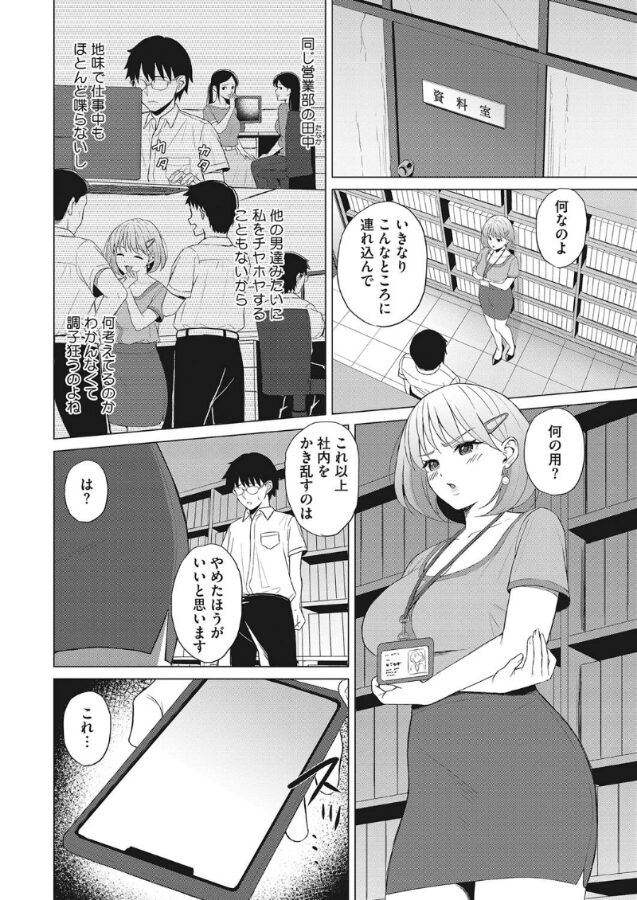 真崎さんは社内の清純アイドルを演じてるけど、裏では不倫して計算高く振る舞う狡賢いOL。営業部の田中は口数少ない謎の奴だ。田中は不倫写真を示して、真崎に忠告する。それを性奉仕と引き換えになかったことにしようとする真崎だが、田中のチ●ポ精力に驚き、パンティに包んで手コキし、射精させても、まだ勃起し、立ちバックで串刺しにされてしまう。真崎はデカチンに降参し、田中の女になるしかない。