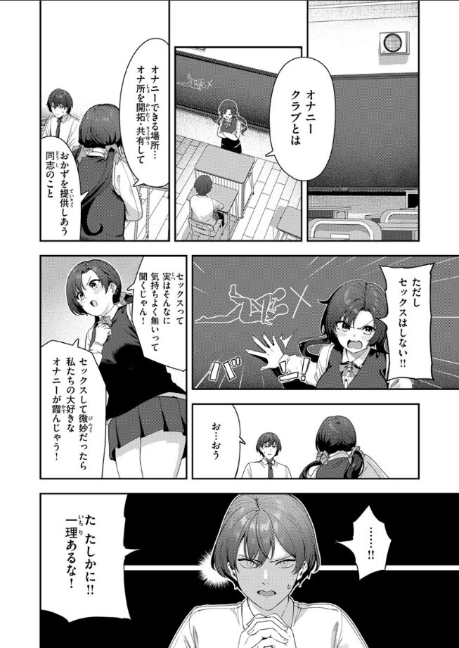 豪快なオナニーからの潮吹きは迫力もすさまじい。オナニークラブの2人の絆が(あまりにも変態的な形で)深まっていく話そのものも面白いと思いました。