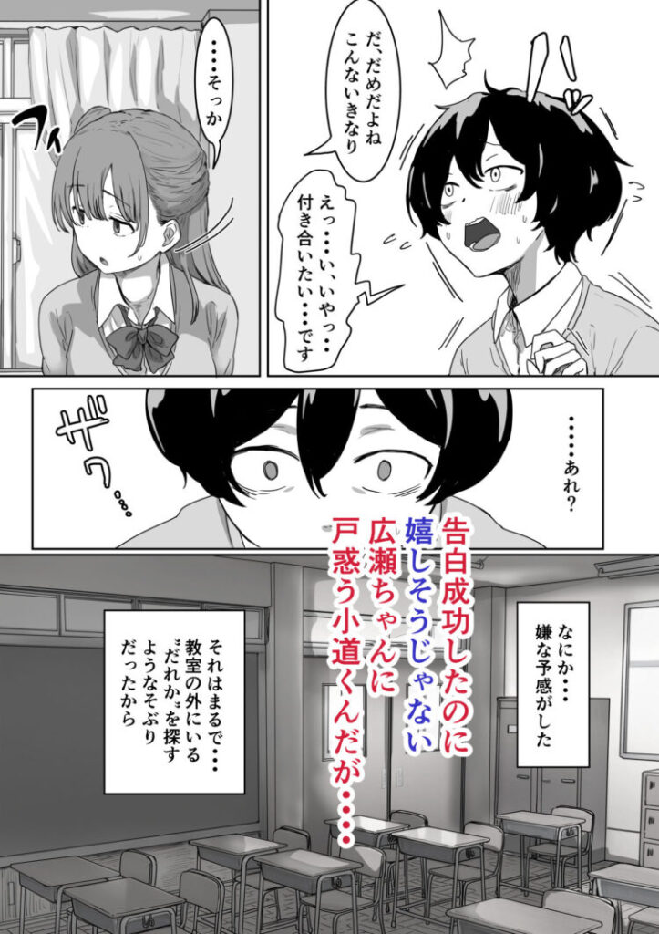 | 罰ゲームで告白した美少女がHな目に遭ってしまう作品。 罰ゲームで陰キャの「小道」に告白ドッキリをすることになった「広瀬」。 ネタばらしができずにいたところ、小道にエロいことをされてしまいます! 偽りの恋人関係になり、彼氏の立場になった小道がヤリたい放題しているのがイイですね。 拒むことができず、体を愛撫されて感じてしまう広瀬がエロいです。 大人しい性格の小道ですが、エロいことに関してはかなり大胆! 広瀬が徐々に快楽に堕ちていき、アヘ顔を晒しながら喘ぐ様子が堪りません。 嘘から始まったお付き合いですが、なんだかんだでハッピーエンドっぽい終わり方になったのも良かったです。 |