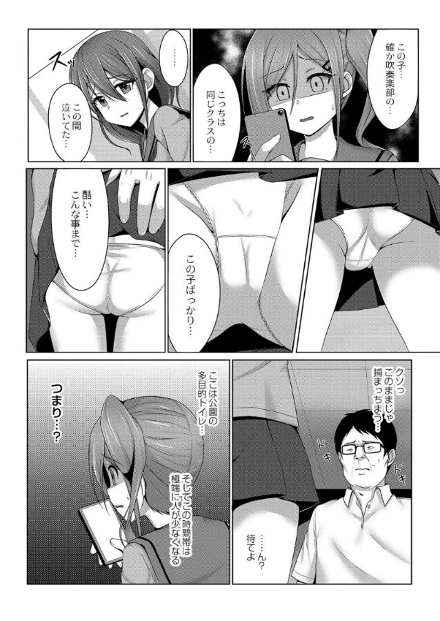 「いや…こんなの口にいれたくない…いやああ!」正義感が強い楓は同じ学園の女子生徒が盗撮されている現場を目撃する。それを制止しようと逃げる犯人をトイレへと追いつめるも逆に脅され拘束されてしまう。携帯を壊され、イライラしていた犯人は楓の携帯で彼女のハダカを撮り、遂にはその胸を弄られ…。自身の恥ずかしい写真をばら撒かれる事を恐れた楓は次々と犯人に嬲られ、凌●される。こんな臭いもの咥えたくない…どうして…私は正しい事をしただけなのに…!