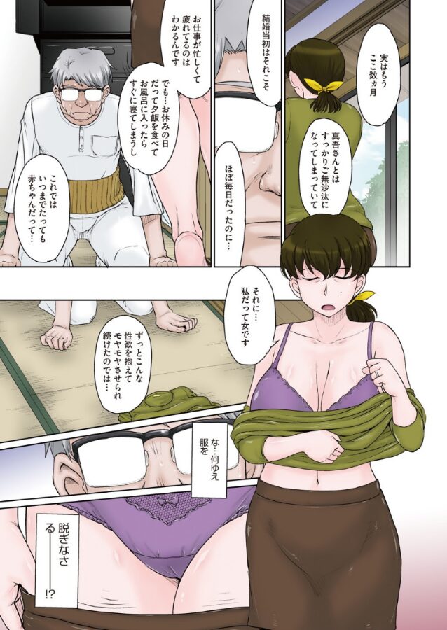 10年前、長年連れ添った妻に先立たれ、今は息子夫婦との3人暮らし。いつもと変わらぬ我が家の朝の風景だったが…今朝は気まずい。昨晩、息子の嫁の湯上り姿が実になまめかしく…つい襲ってしまったのだ。許してもらおうと誤ったが…なんと真奈美さんの方から求めてきた!