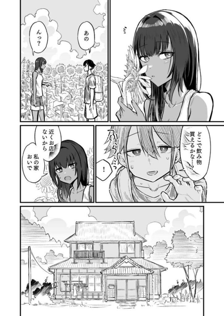 | 亡き祖母を偲んで田舎に帰省した主人公の男性は、その祖母が生前好きだったひまわり畑を訪れますが、そこで暑さにあてられてしまうといったごく普通の漫画のような始まりが少し印象的でした。 ですが、もちろんこれはその手の漫画なので、そこを助けてくれた少女の家でひと休みすることになり、ここから面白い部分になっていきます。 早速その家では少女がいかにも無防備な薄着で乳首や見えそうな格好をしていたことで、更にそちらへの期待が膨らみました。 そのような格好をしていると危ないとたしなめた男性でしたが、全く意に介していない大らかな性格の彼女に少し引いてしまいながらも、つい寝てしまった間に彼女の方から積極的に行為を求められるとそれに応じてしまったところはやはり男性だと言ったところでしょう。 その後は日焼けの跡が生々しい行為中のシーンになるので、そういったシチュエーションが好きな人にとてもおすすめです。 |