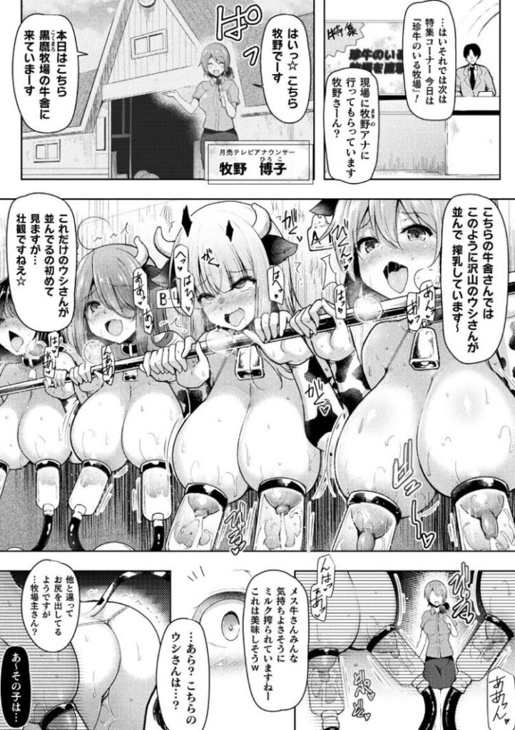 牛娘の人間牧場にいるという『珍牛』のレポート特番!並ぶ巨乳を搾乳されて嬌声を上げる牛娘たちの中に、乳房ではなくふたなりから搾乳できるメス牛娘が!?壁尻状態で無防備に晒されたふたなりちんぽを女性アナウンサーにシコシコされて盛大に噴乳するメス牛。壁の反対側からはミルクの出ないおっぱいを揉まれたり乳首を扱かれたりして巨乳とふたなりをぶるんぶるん揺らして大喜び!※『二次元コミックマガジン ふたなり壁竿 壁尻ふたなりヒロイン搾精イキ地獄!Vol.1』に掲載されている作品です。