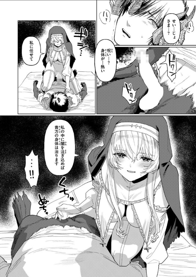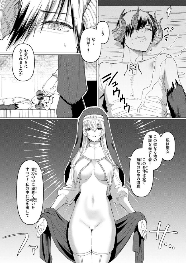 「私は聖女。この身体は全て解呪のための道具です」悪鬼の呪いに蝕まれた男が教会に運び込まれた。誰にも見られてはいけないという聖女による解呪の儀式が始まると、手始めに彼女の聖水が男のカラダにかけられる。僅かに正気を取り戻した男は、儀式の内容が呪いの力を聖女に移すことだという事実を明かされ、徐々に悪鬼の姿になっていく聖女のカラダを貪り始める…!!
