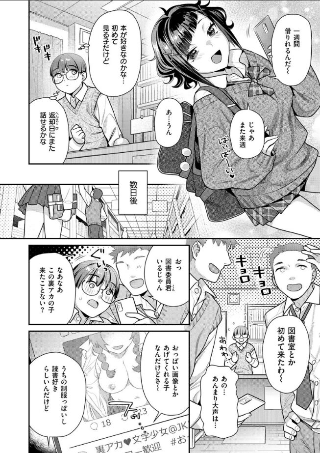 「バレたくないなら人が来ちゃう前にはやく…♪」図書委員をしている僕には、最近気になる女のコがいる。派手な見た目に似合わず、重厚な本を颯爽と借りていったあのコ。しかしある日、偶然にも彼女が《裏アカ女子》として、SNSにエッチな自撮りを上げていることに気付いてしまった!! 何故か撮影の協力まですることになって……。刺激たっぷりのドキドキ校内SEX配信、オンエアスタートです♪
