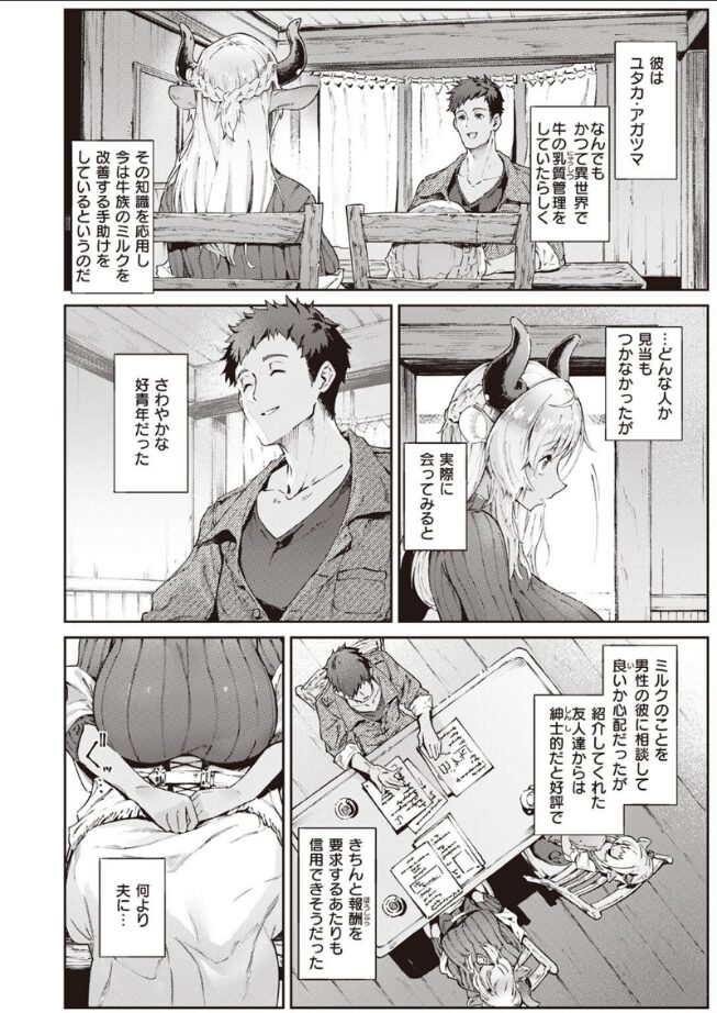 「私のスケベおま●こに……特濃おチ●ポミルク……たくさんくださいッ!!」爆乳牛族のラヴィニアは夫を事故で亡くしてから乳の出が悪くなっていた。――良質なSEXがミルクの味に影響を与える。そう教えてくれたのは、かつて異世界で乳質管理の仕事をされていたというアガツマさん。残された娘・シャルロットとの生活、寂しい自慰ばかりの性活、そしてアガツマさんに対して膨れ上がっていく火照るような感情。亡き夫に面影を重ねながら――射精され、搾乳されまくる!!