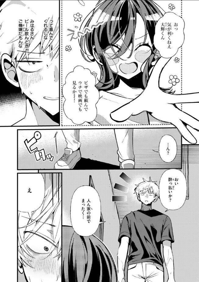「慰めてもらおっかなあ…なんて」春―新生活。《隣人との恋》なんてものに期待していたものの、蓋を開ければ、お隣のみはるさんとは男友達みたいな関係になっていた。みはるさんの為にカレーを作ったり、一緒に飲んでゲームで勝負して、そのまま俺の部屋でザコ寝したり……。でも、恋愛じゃなくても、こういうのも全然アリだ。ずっとこの関係が続けばいい。なんて思っていたある日の夜、俺の部屋のドアの前に、いつもとは違う大人っぽく着飾ったみはるさんがワケ有りな雰囲気で座り込んでいた。気になるお隣のお姉さんの失恋がきっかけで、2人の関係は……??