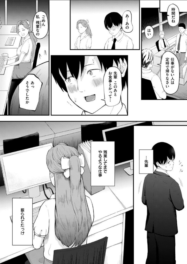そんな先輩はよく部長に呼び出され、そしてなぜか疲れた様子で戻ってくる。妙に色っぽいその姿と、定時になっても帰る様子のない先輩の様子が、少し気になりはするけれど……。