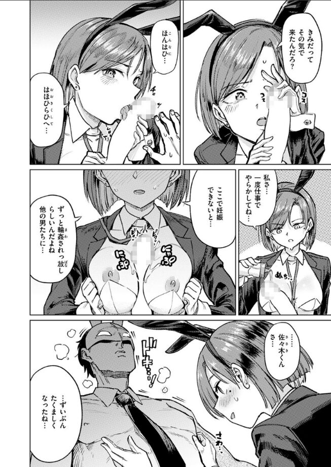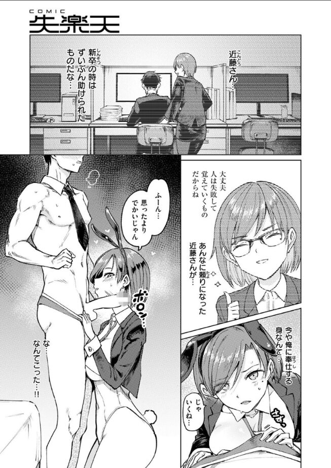 | 作品内で描かれている行為はめちゃくちゃエロいのに、あくまでも仕事としてやってる感じが興奮をそそられました。さらにこの作品の面白いところは、ラビットマッチングというサービスの新入社員に密着するというドキュメンタリー風な演出がされているところです。 そのため、普通の漫画とはちょっと違った新鮮な雰囲気を楽しむことができます。どんどんプレイが激しくなっても、淡々とインタビューが続行されるというシーンなどはシュールで面白さもありました。 最初は真面目に答えていた新入社員の子も、快感によってちゃんと喋れなくなっていくのがいやらしくて良かったです。スタイルが良いのでバニーガールの衣装も似合っていて、コスプレ好きにもおすすめできる作品だと思いました。 |
