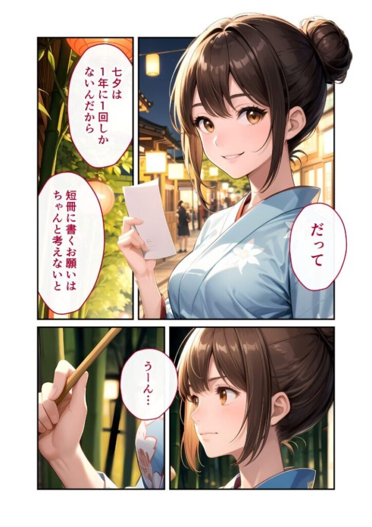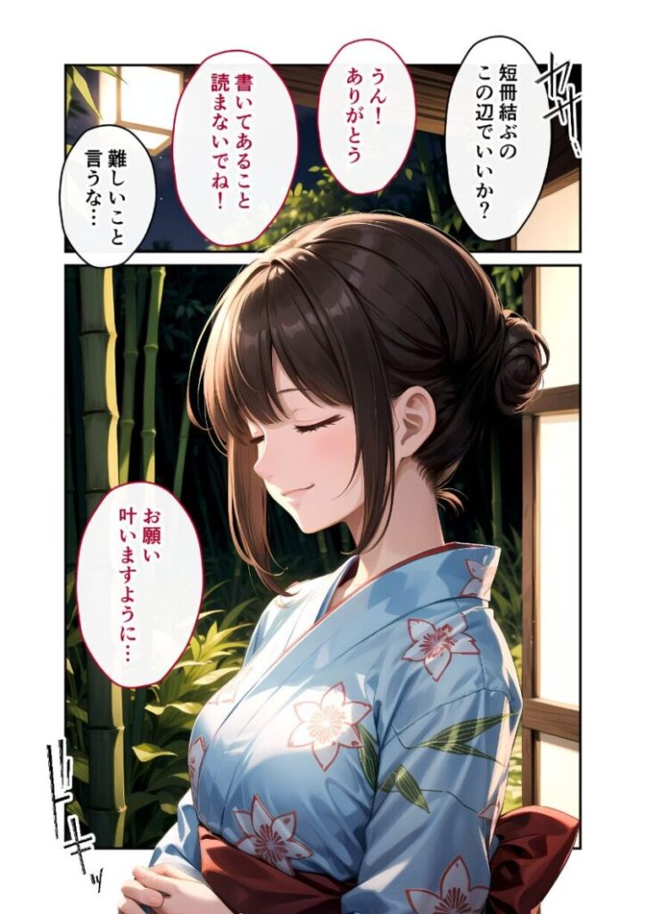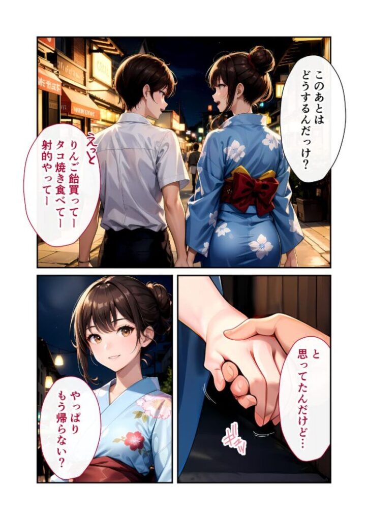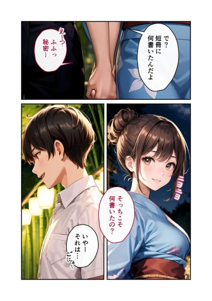 「お願い、叶いますように…」七夕祭り。散々悩んだ末に短冊に願い事をしたためた彼女は、真剣な様子で祈っている。浴衣姿の彼女はいつもより色っぽくて、その姿につい見とれてしまう。打ち上げ花火を見た後は、屋台をめぐって買い食いをする予定だったが――「やっぱり、もう帰らない?」「だって、2人きりになりたくなっちゃったんだもん」彼女がそう言い出したのには、先程短冊に書いた願い事が関係していて―…?本編51P+AIイラスト163P収録!【注意事項】※本作品のシチュエーションは全てフィクションです。登場する人物や設定等は、すべて架空のものとなります。※この作品内に登場するキャラクターは全員20歳以上です。※本作品はStable Diffusionを使用して制作しております。※犯罪、その他違法行為を美化または助長する意図はございません。