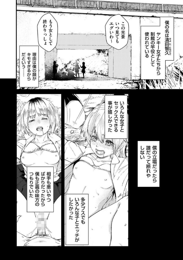 男主人公の清田智久がとにかくキモイ男で、ビジュアル的にも生理的に受け付けない人物でした。そんな清田が制裁役としてヤンキー女子から竿役として使われるという設定があり、このキモイ清田が可愛い女の子をハメていく様子に興奮することができました。