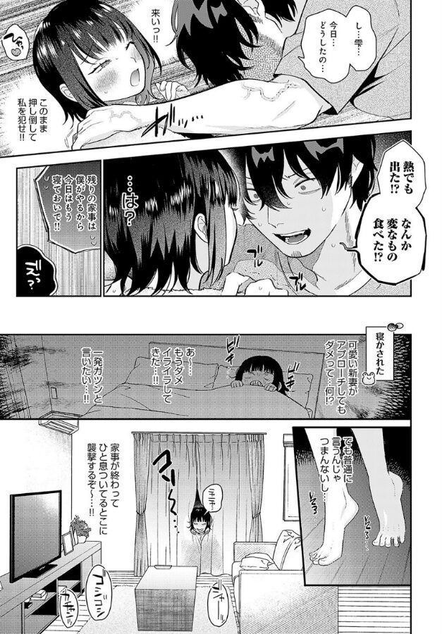 今日で結婚してちょうど半年…なのに…なのに…入籍当日にセックスして以来全く手を出してこない夫・爽雨!! そのせいでムラムラしっぱなしでオナニーばかりの私!! 今日こそ念願の夫婦セックスをするため、裸エプロン、競泳水着…エッチに誘惑してみることに♪なのに爽雨は手を出してこない。一言文句言ってやんないと気が済まないから、一息ついている爽雨をいざ襲撃! するとなぜか私でオ…オナニーをしていた!?どうやら爽雨にはセックスできない理由があったようで、仲直りした2人はついに半年ぶりのセックスに臨む――!!!超生っぽイチャラブ作家・GURIDA先生が贈る、欲求不満巨乳若妻の求め合い中出しセックス☆