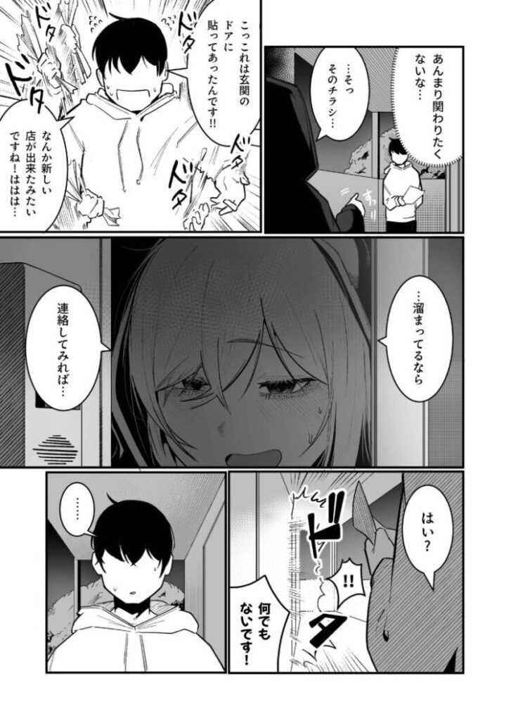 | いつものコンビニのバイトから帰宅したところ、怪しげな風俗のチラシが自分の部屋のドアに貼ってあったのを発見したところから始まりますが、そんなチラシを貼られてはたまらないと思ってしまいました。 それを見ていると隣の部屋に住むいかにも陰キャな女性から、溜まっているなら電話をしてみればと勧められ、つい電話をしてしまったところ、やっぱり怪しいので断ろうとすると、タダでもいいのでと言われてついOKしてしまったのは男性としての性でしょう。 そして、やってきたのは先のお隣さんで、学生の頃から引きこもりながら、エロイ体をしていると言われたことがあったため、試してみたいと思ってのことだと言われてそれに付き合うことにしたのも、やはり男はこういうものだと思いました。 それからぎこちないながらも2人は行為に勤しむことになりますが、あのチラシを貼ったのはもちろん彼女で、隣に住んでいたことでこんなことになりましたが、現実的ではないものの、全体的に見ると何ともうらやましい限りの話でした。 |