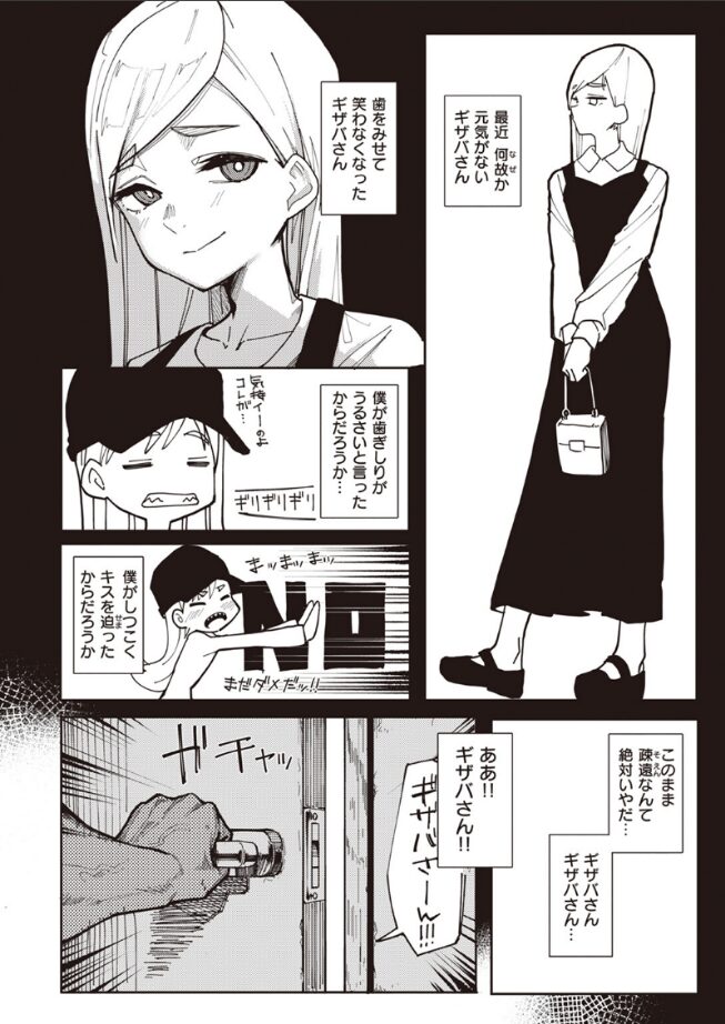 「ち……ちがうぞ!! これは……ッ」彼女のギザバさんは、歯がギザギザだ。食後の後は必ず歯に挟まってないか確認したり、ストローは大概穴が開いている。そんなギザ歯が、可愛いギザバさん。だけど、最近何故か元気のないギザバさん。心配でギザバさんの部屋を訪れると、ギザ歯で僕を傷つけないようフェラの特訓を!?ギザバさんの不安が消えるように、二人で解決していこう……!