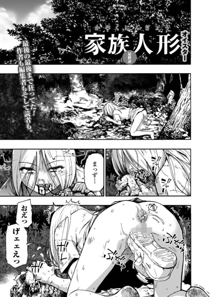オイスター氏による凌辱ホラーの金字塔『家族人形』シリーズの最終話、第十話は、姉妹の極限的な運命を描き切る壮絶なクライマックスです。妹の志保を探して山奥の廃墟に踏み込んだ姉の芹那は、そこで謎の大男に襲撃され、友人を惨殺された上で、巨根をねじ込まれるという筆舌に尽くしがたい屈辱と羞恥に晒されます。この時点で、彼女たちの日常は完全に破壊され、舞台は狂気の「家族」による性奴隷の地獄と化します。