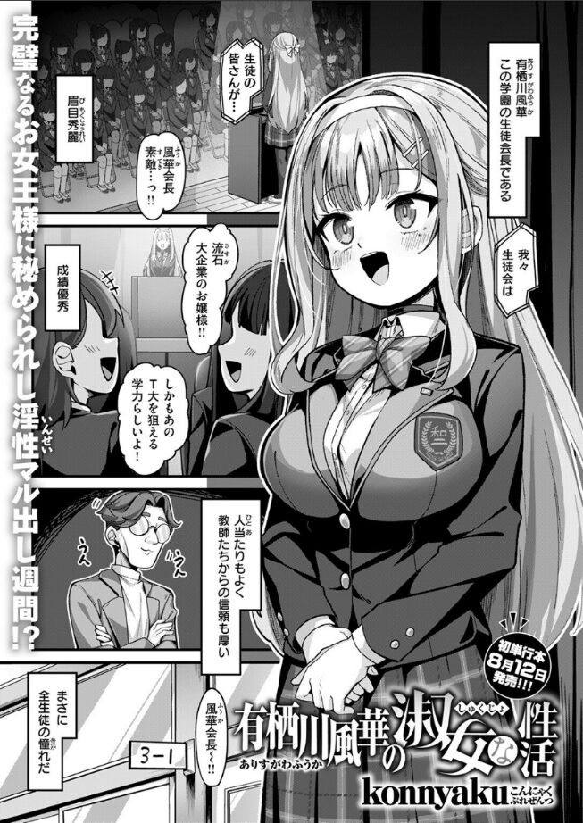 完璧お嬢様であり学園の生徒会長、有栖川風華(ありすがわふうか)には、同じ生徒会の光太(こうた)だけが知る秘密があった。秘密その(1) エッチなことに興味津々秘密その(2) 仕事しない秘密その(3) 学校でHしている秘密その(4) 光太と付き合っている期末テストを控えた光太は終了までのSEX禁止を提案し、それを承諾する風華は一週間耐えるものの欲求が溜まりに溜まってしまい、テストの最中にある行動に……!?