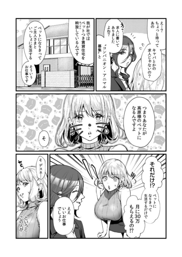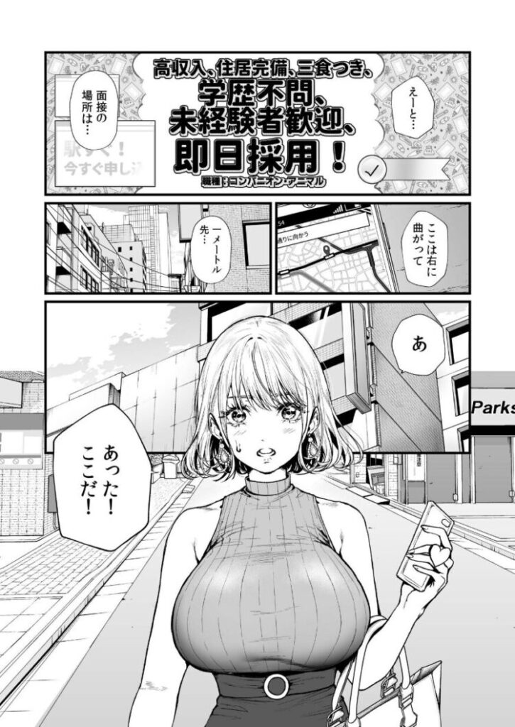 『高収入、住居完備、三食付つき』『学歴不問、未経験者歓迎、即日採用!』ある求人情報を見つけて面接に来た佐山愛菜。怪しいと思いつつもお金に困っていた彼女だったが、社内に入るなりいきなり社員の男に胸を鷲づかみされる。「ん…合格!さっそく仕事ですよ」えっ?今ので面接終わり…!?やっぱりここはヤバいところかも…!!部屋に案内されるとそこに大人しそうな男・高原が座っていた。そこで愛菜は、高原の『ペット』となって一緒に生活してもらうと告げられる。悩んだ末に契約書にサインすると、主従契約締結の儀が始まる。それは社員の目の前で愛菜と高原が●ックスするというものだった…