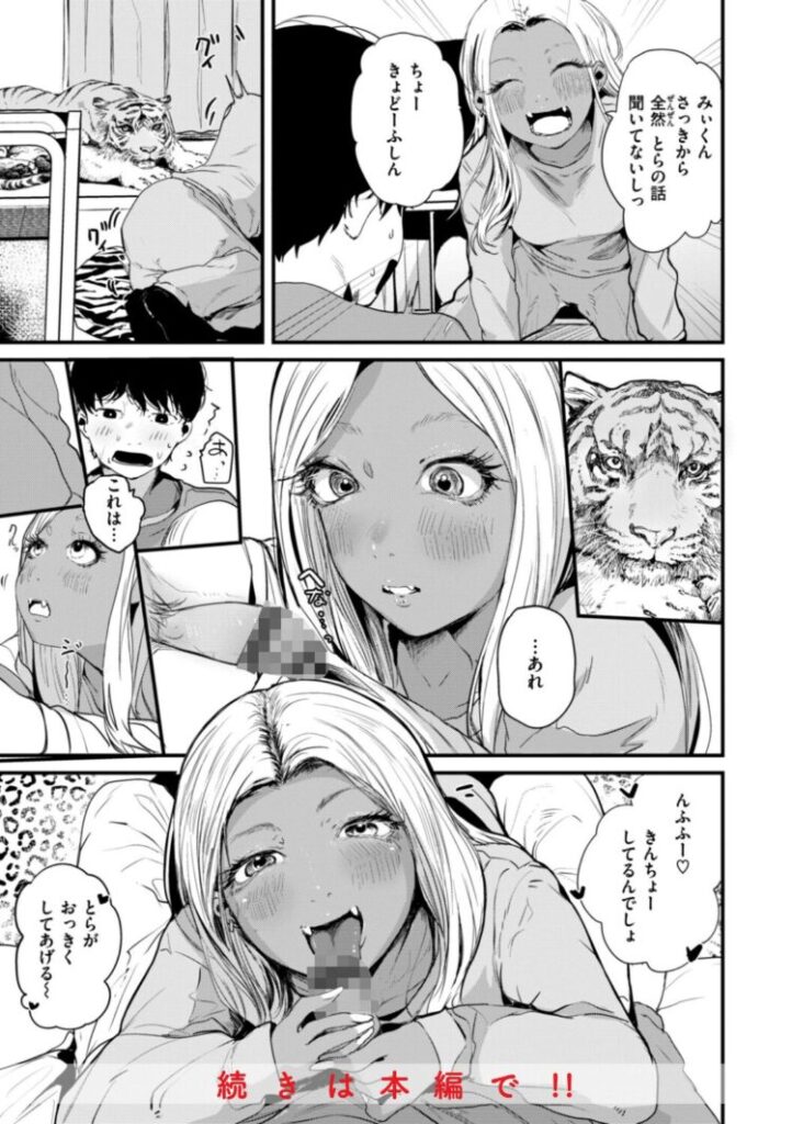 (居る…確実に…しかも生きている…)可愛い黒ギャルカノジョの虎子(とらこ)の家に、期待に胸を膨らませてやってきた三井(みつい)。さっそく部屋に上がると、そこには一般家庭にはいるはずのない生きている《虎》がいた……虎子からえっちのお誘いを受けても、虎の圧力が凄すぎてそれどころではない…中々勃〇しない状況を虎子は自分に魅力がないと勘違いしてしまい、落ち込んでしまう。自分のふがいなさのせいで、彼女を泣かせてしまっていいのか…否!!生命の危機を感じるほどのプレッシャーの中で、三井は最後までヤリとげることができるのか……!?