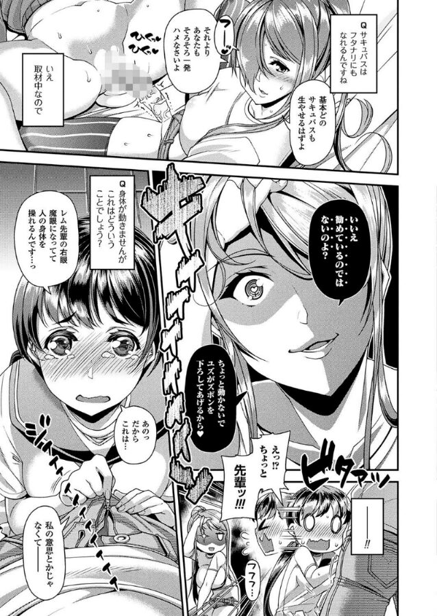 現代社会に溶け込む淫魔たちの生活に密着するドキュメンタリー風Hストーリー後編! 淫魔が共同生活する一軒家への密着取材を続ける取材者の青年は、家主で年長者のレムレムと初心な新米淫魔のユズユズに案内され、現実ではほとんど動かず淫夢を介しての吸精を好む怠惰な淫魔、ラムラムの部屋を訪れる。レムレムに勧められ眠り続ける彼女へペニスを突き入れると、ラムラムがどこかの少年に見せている淫夢を共有して極上の膣内に精を放ってしまう取材者。さらに発情したユズユズから150年以上護った処女を捧げられ、瑞々しい締まりを堪能する彼だったが、目を覚ましたレムレムと男漁りから帰ってきた褐色ギャル淫魔のリカリカ、本気になったレムレムも加わり大乱交へと発展して――。
